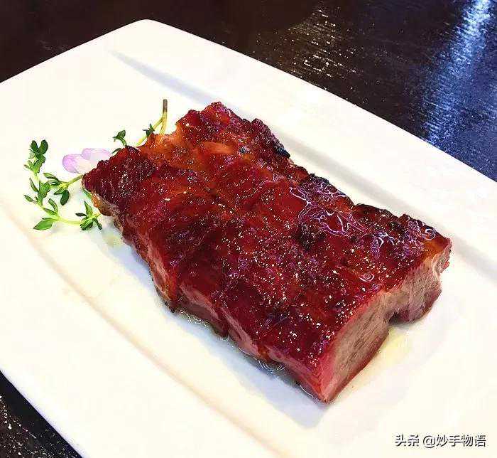 蜜汁叉烧选材用了每只猪肩胛骨的两枚肉,叫枚肉或梅肉或里脊肉,是猪身上最嫩的一个位置,用作叉烧再合适不过。虽然看起来肥肉部分不多,但厚切的做法,搭配秘制的香甜酱汁,火候的控制,让叉烧多了一份松软带汁的柔和。这份星级叉烧称得上是一线水准,甜味适口,汁水丰富,肉质细嫩,肥而不腻,瘦的部分丝丝入味,肥的部分入口即化,外焦里嫩,一大口非常满足,令人赞不绝口的一道菜。