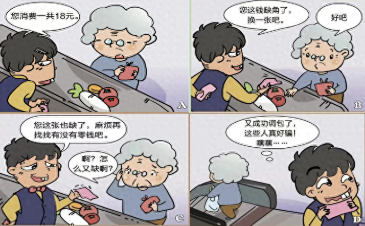 在涉案人员接到群众交付的小面额纸币后,快速“撕角”,以“缺角”为借口要求群众更换,直至群众拿出百元真币,他们迅速将事先准备好的百元假币与真币调换,将“掉包”后的假币归还群众,并以“缺角就缺角吧,一百块的不好找”来打圆场,得手后立即转移。