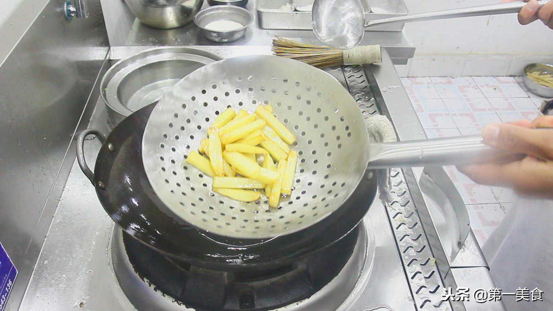 锅里烧油,油烧至5成热时,控去土豆的水分,倒入油锅炸制。把土豆外壳炸的变硬以后就可以捞出。