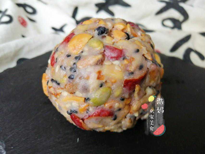 五仁馅料(约50g,16个)所需材料:花生仁120g、南瓜籽50g、核桃仁100g、瓜子仁100g、大枣55g,葡萄干55g,黑白芝麻20g,黑枸杞10g。麦芽糖100g、水65g、食用油85g、白酒6g、糯米粉75g、熟低粉55g。