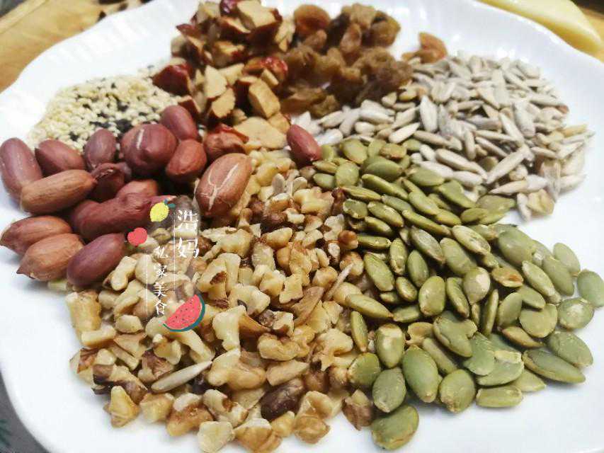 烤熟的果仁去皮,根据情况切一下。瓜子仁不需要切。