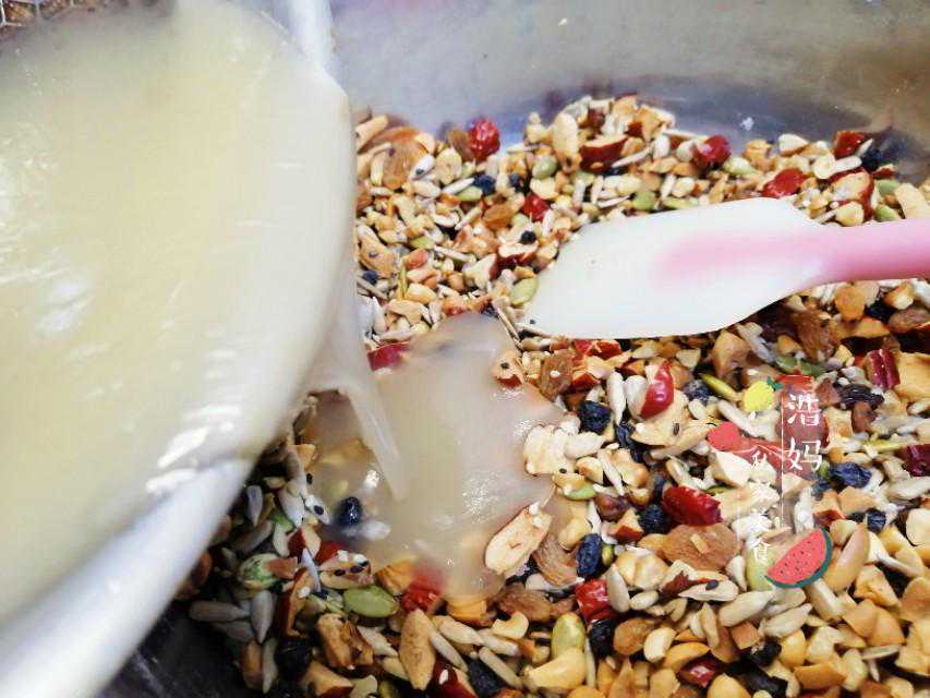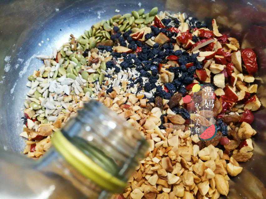 把所有果仁分别放烤箱烤熟,一定要分别烤熟,因为成熟时间不一样,不要放到一起免得有的糊了。