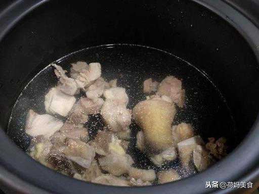 砂锅中加入足量多的矿泉水,放入焯过水的鸡肉,放入料酒,姜片,葱结,大火煮开转小火炖40分钟