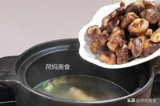 时间到,放入泡好的香菇,再炖20~30分钟。香菇放太早的话,炖出来的汤颜色很比较深,鲜香菇的话15分钟就足够了。