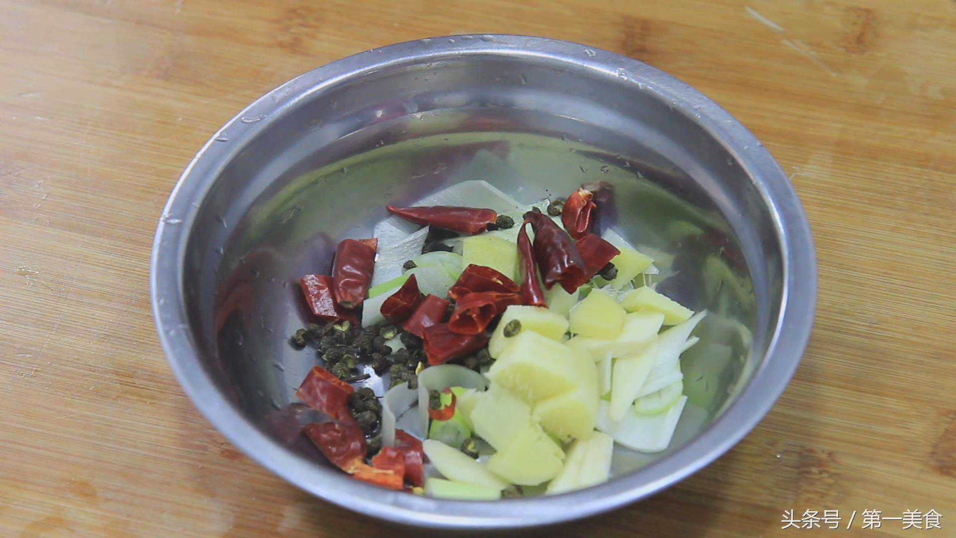 再抓入花椒2克,干辣椒2克,洋葱切成洋葱片,抓散以后放在锅里垫底,