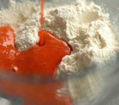 9、将200克面粉和110克红椒泥混合搅匀,揉面至面团表面光滑。