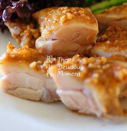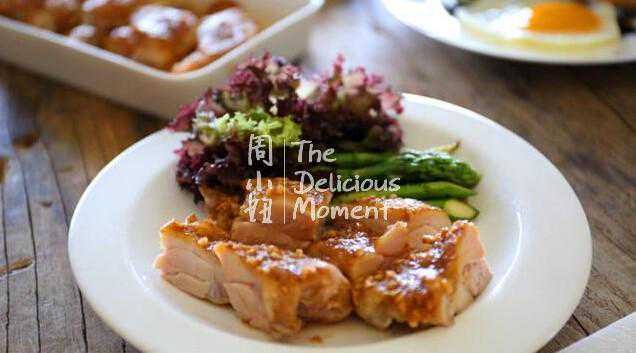 7、将留在烤盘上的肉汁加热浓缩后浇汁到鸡肉上。