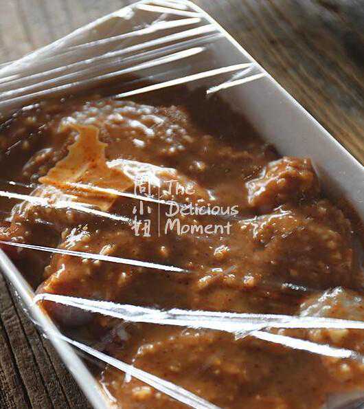 3、把调料搅拌均匀后,均匀的涂抹在鸡腿肉有皮的那一面。