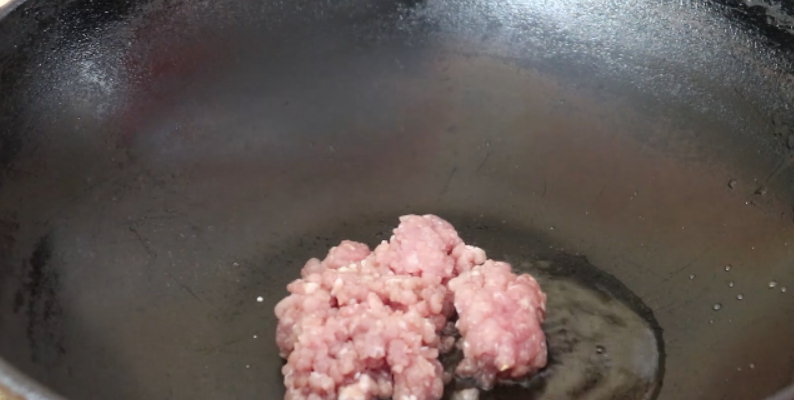 5、准备一块儿比较瘦一点的猪肉,将猪肉稍微的清洗一下,然后把它剁成肉末,如果嫌自己剁肉末比较麻烦,那么也是可以去买一些现成的肉馅的。剁好肉馅之后咱们再起锅烧油,锅中油烧热了之后把肉末倒进去,然后炒到肉末变色。