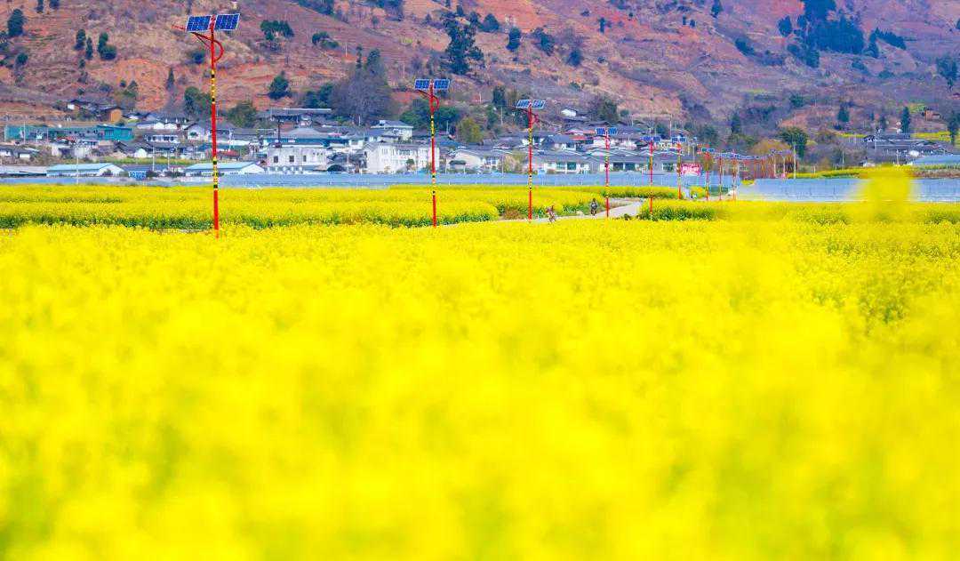 米易县普威镇,盛开的油菜花延绵不断,到处是黄灿灿的一片。
