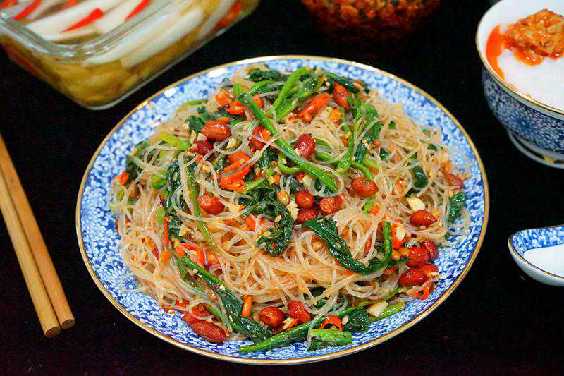 01.凉拌菠菜粉丝食材:菠菜一小把、粉丝三小个、生姜末3g、大蒜3g、小米辣五个、生抽一勺、香醋一勺、香油半勺、糖小半勺、盐适量、花生米一小碗