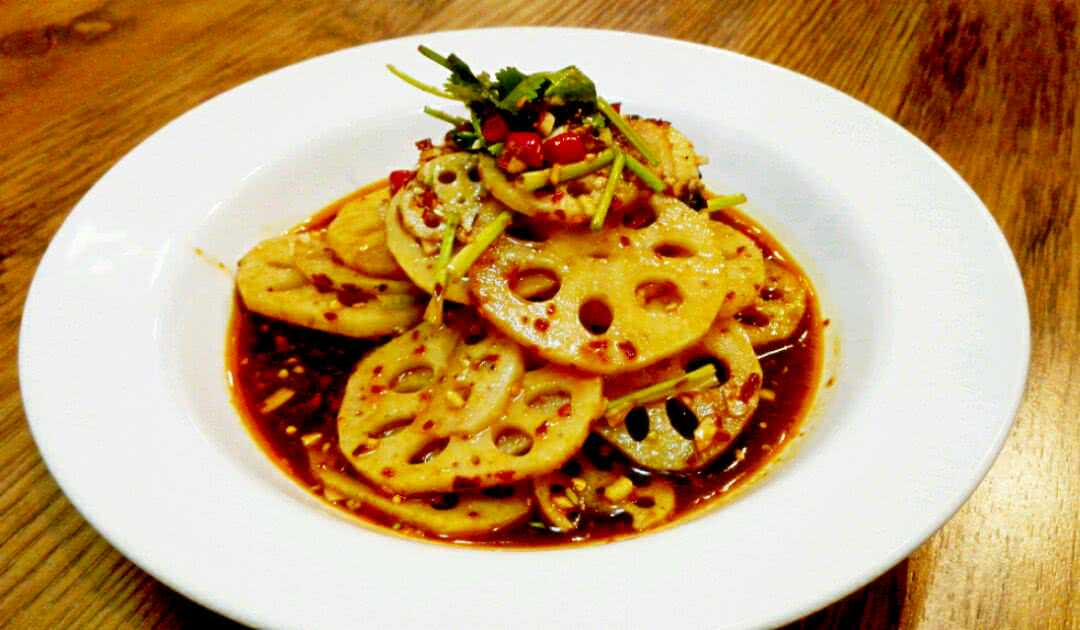 3.藕片加入小米辣,蒜末及所有调味料(醋,糖,红油辣子,麻辣油豆豉,香油,生抽,盐),香菜段。红油辣子的做法在后面会讲。也可以加点西芹进去。充分拌匀,装盘。