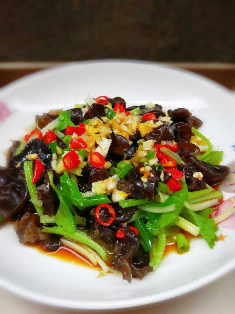 1.芹菜1把、胡萝卜1根、泡发木耳适量盐4克、生抽20克、白糖4克、香醋20克、蒜末适量、植物油适量