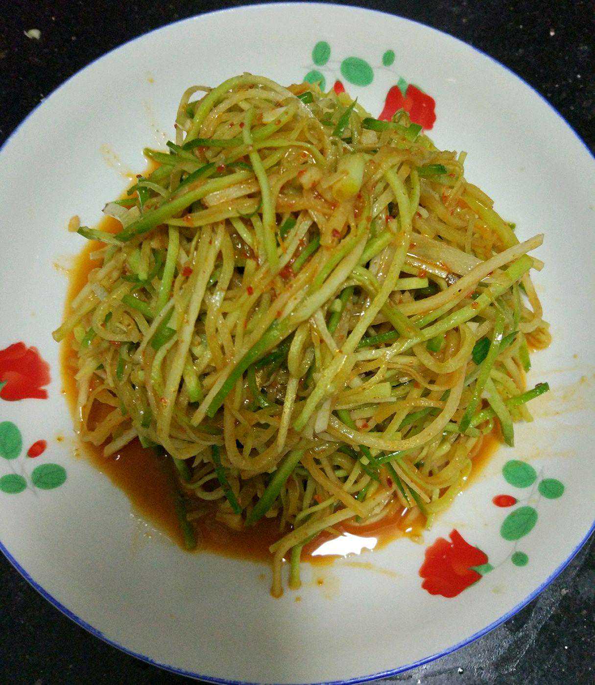 07.凉拌土豆丝食材:土豆2个、酱油适量、醋适量、辣椒油适量、香油少许、花椒少许、糖适量、盐适量、大蒜2瓣、小葱2颗、鸡精少许、青椒2颗