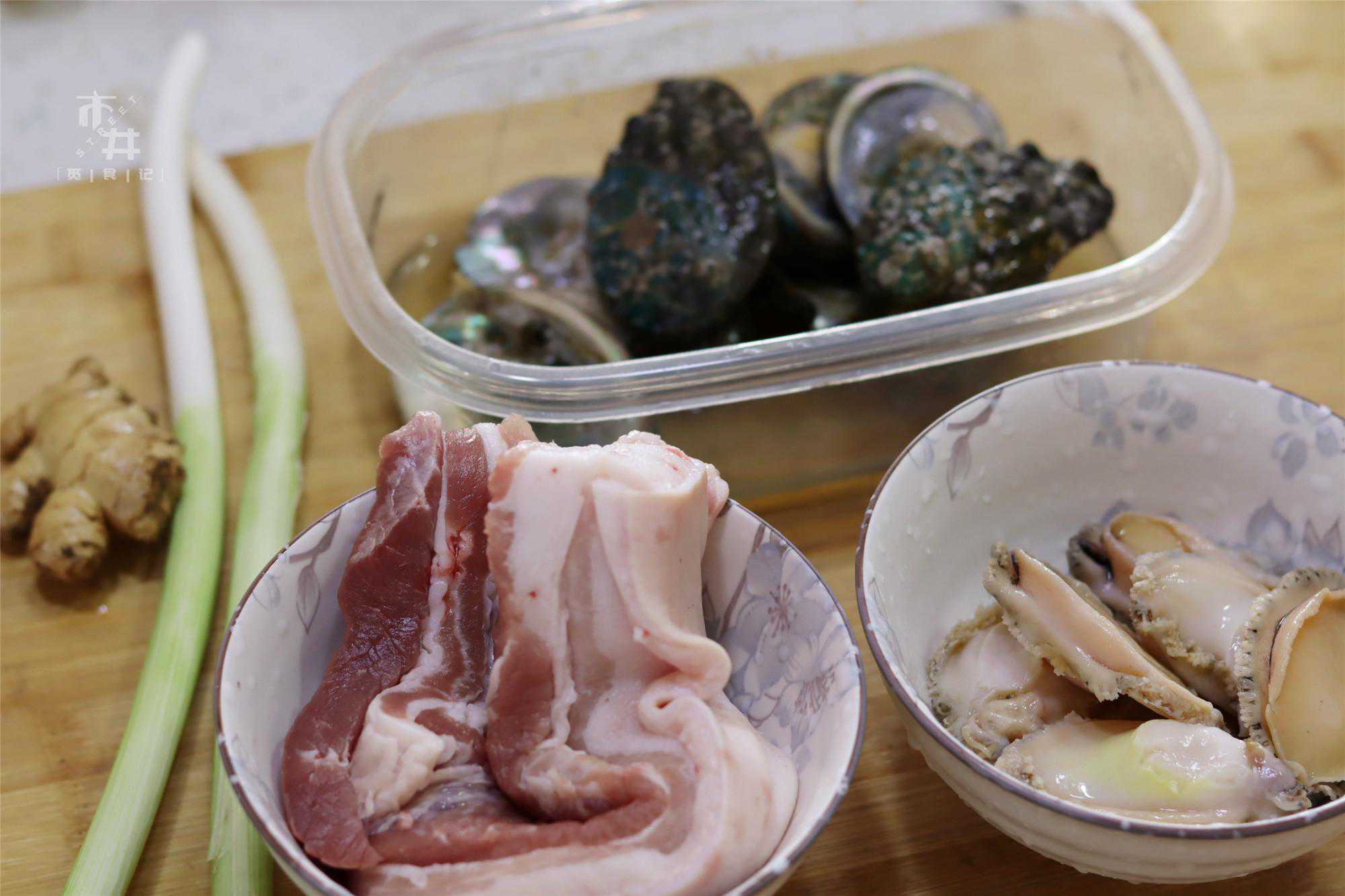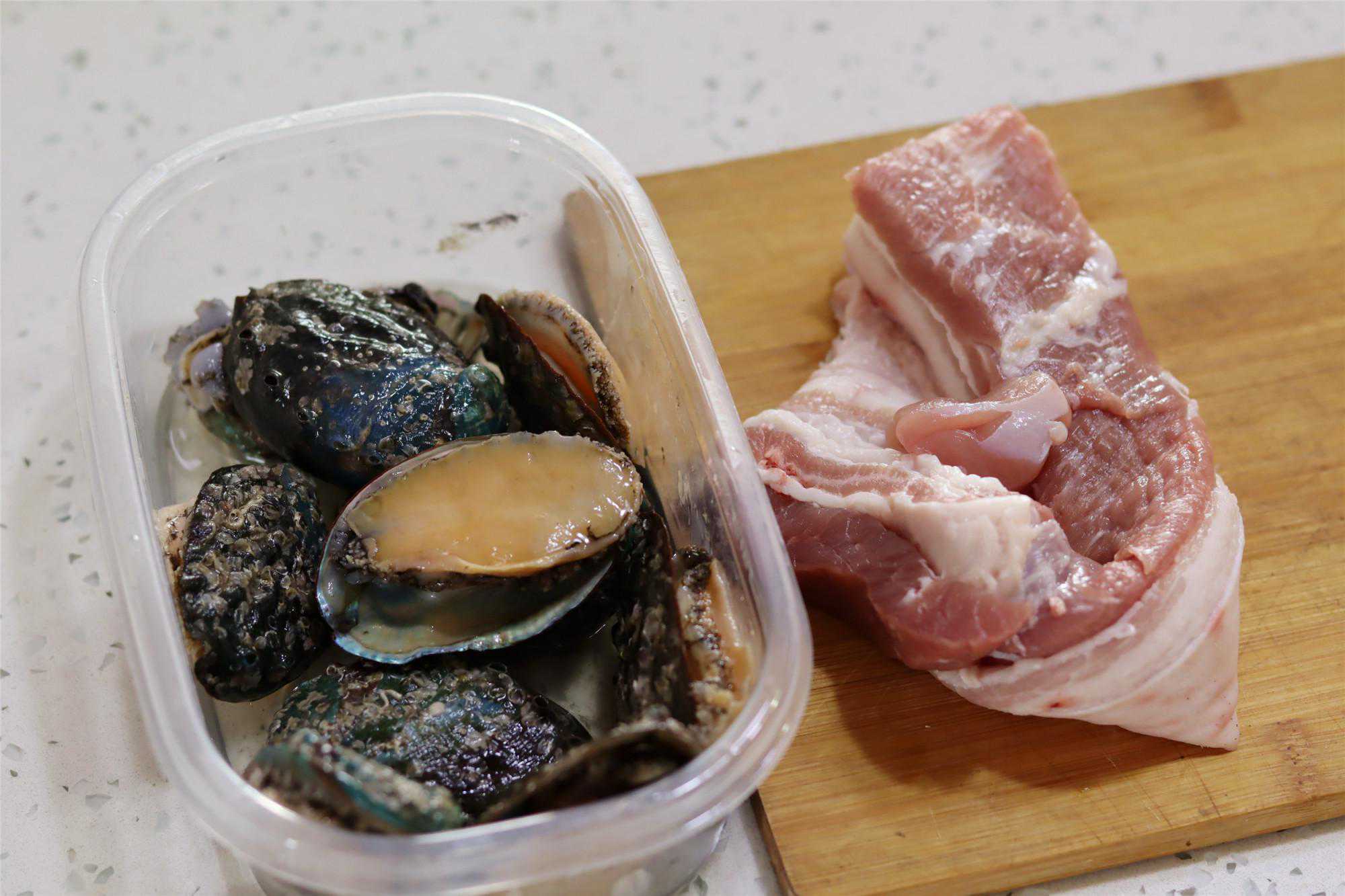 第一步:鲍鱼处理一下,用剪刀最快,伸进去把鲍鱼肉和壳分离,冲洗干净,五花肉清水冲洗即便,擦干水分。