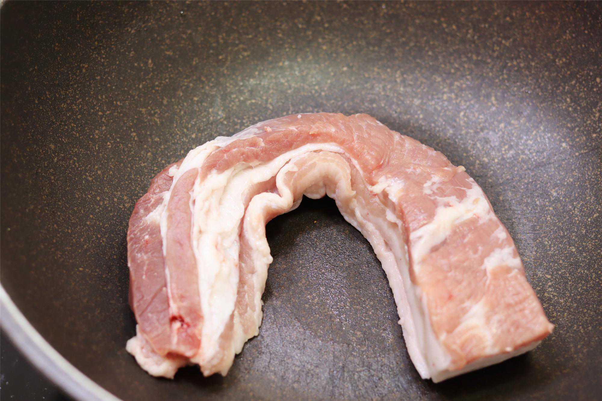 第二步:铁锅烧热,炙烤五花肉带皮的一面,直到有些焦黄卷曲,冲洗干净备用。