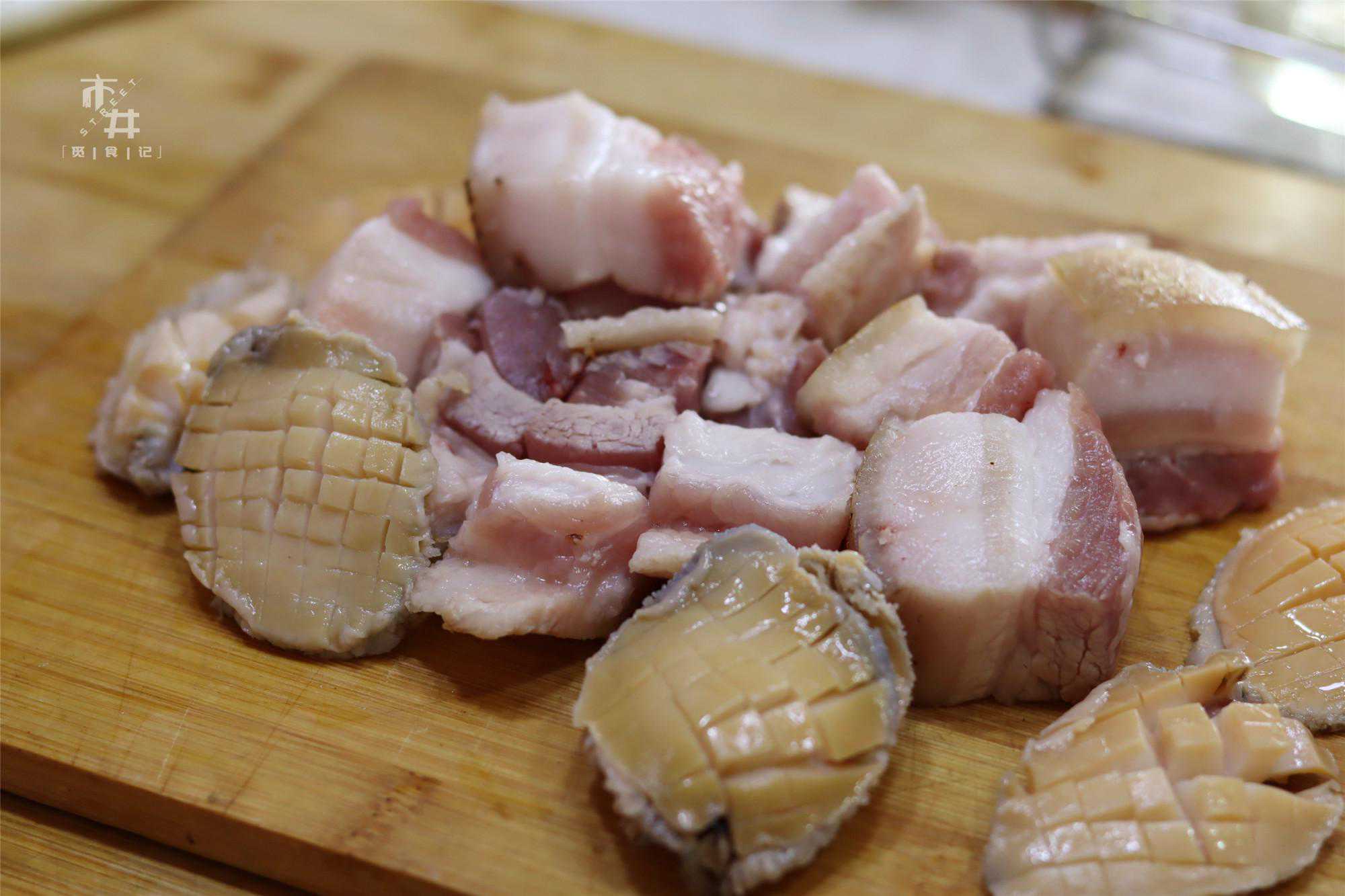 第三步:鲍鱼肉改十字花刀,可以切的密集一些,效果比较好,五花肉切大块备用。