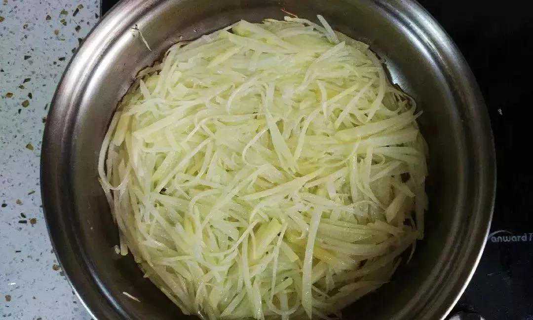 4、油热后下入土豆丝,尽量不要翻炒,迅速用锅铲整形,铺均匀,然后就不要动了!用中火煎;