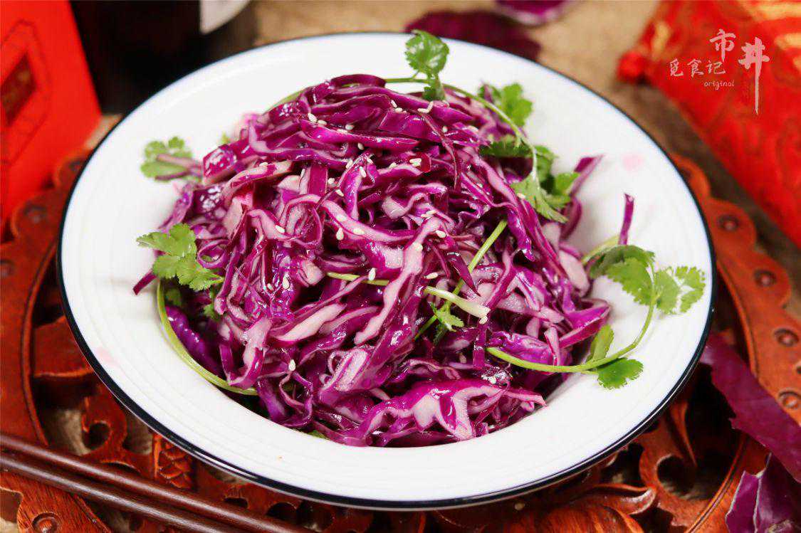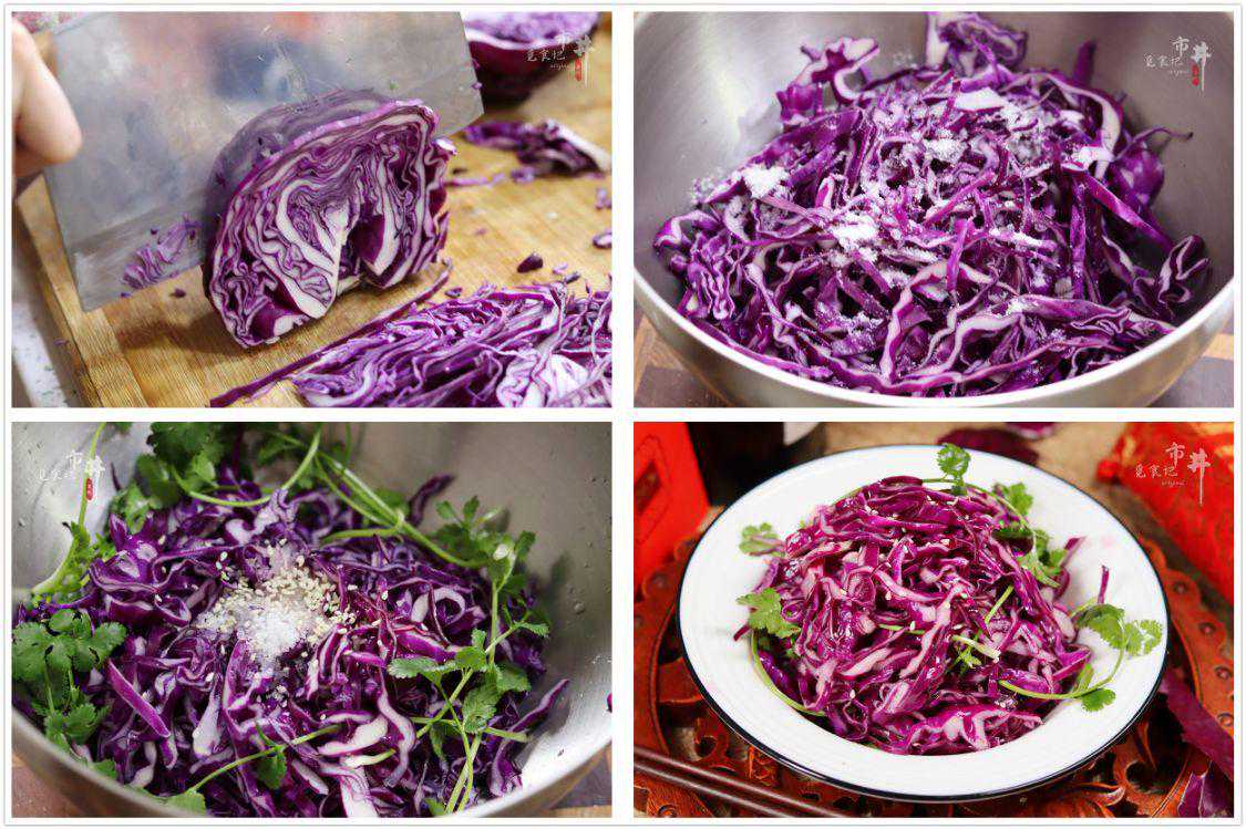 四、【凉拌紫甘蓝】所用食材:紫甘蓝半个,香菜适量;白芝麻、盐、糖、果醋适量。