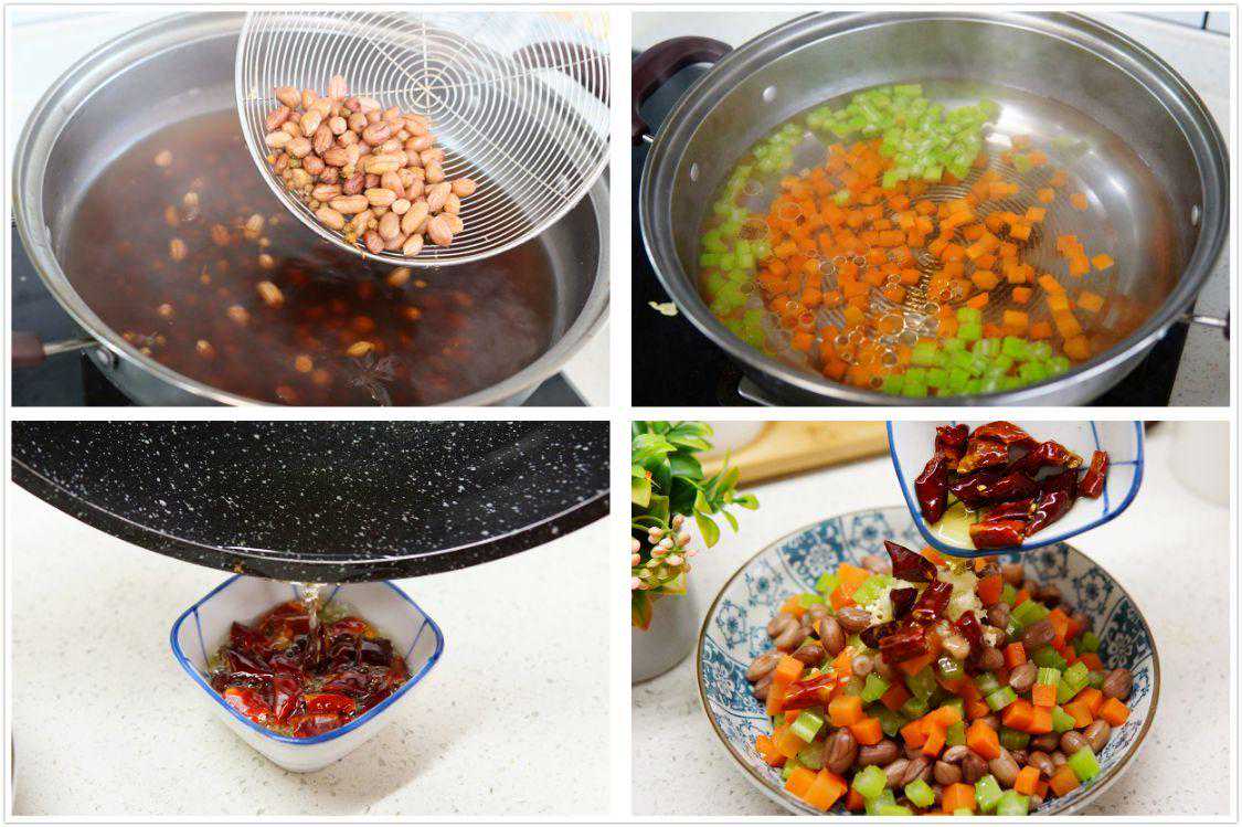 1、胡萝卜、芹菜清洗干净切成丁,花生米冲洗干净,提前用水浸泡1-2小时,生姜去皮切片,锅中加入适量清水,加入姜片、桂皮、花椒、八角煮开,放入浸泡后的花生米,煮开6分钟关火浸泡10分钟。