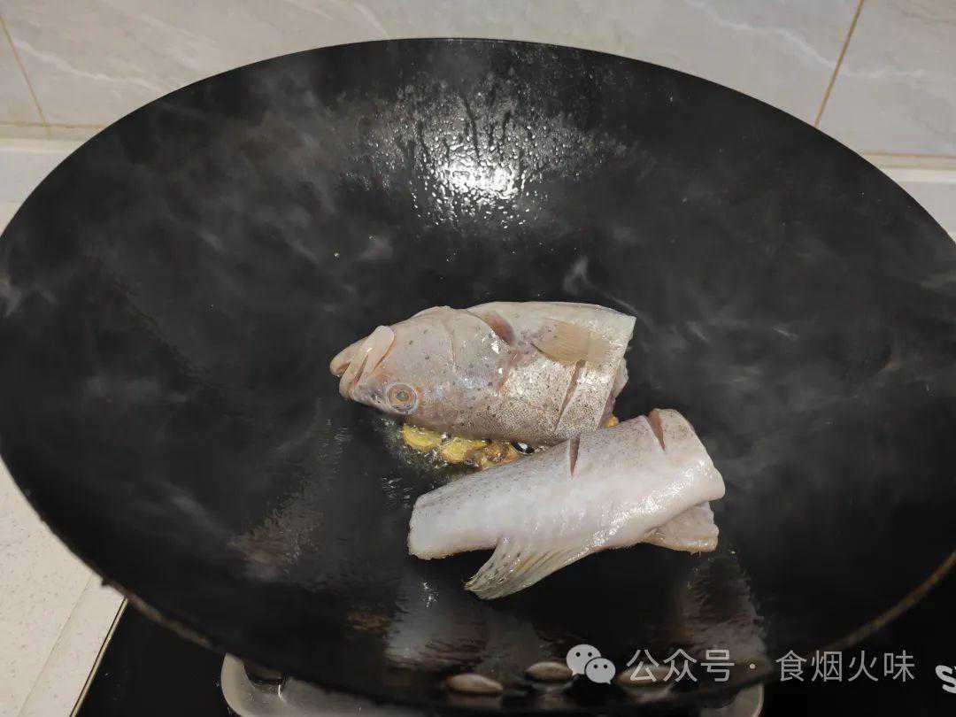 锅里面倒入油,把生姜放入油锅中,小火煸炒一下,煸炒出香味。把生姜炒香之后我们就把备好的鱼块放进去,鱼肉下锅后不要翻动,放着慢慢煎,给它煎煮是两面金黄色,这样子煮出来的鱼肉会更加的鲜美,而且形状也好看。