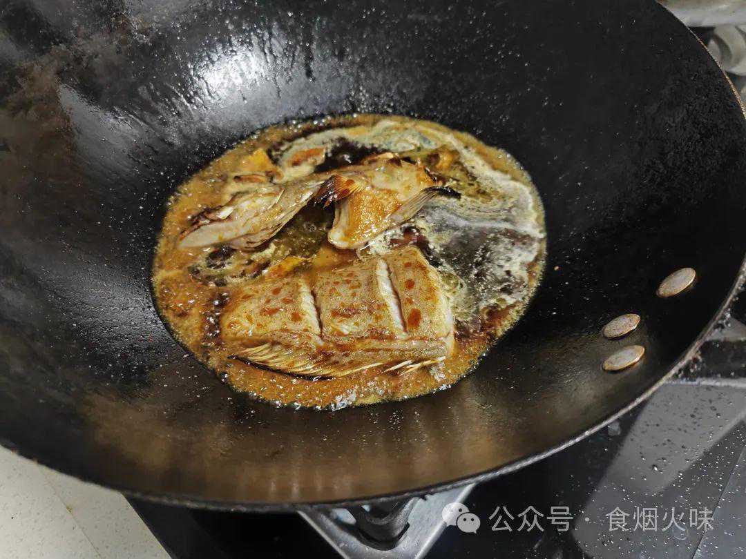 把煎好后的鱼,上面撒上适量的食盐,再倒入适量的酱油,接着放入水,水要稍微跟鱼肉持平,然后盖上盖子放在锅中煮个8分钟。