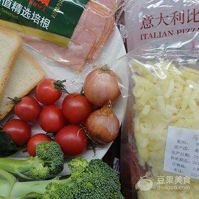 2、吐司片的一面均匀地刷上披萨酱,撒上一层马苏里拉芝士,铺上洋葱圈、小西红柿、培根和西兰花,再撒上少许马苏里拉芝士。