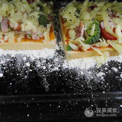 3、烤箱预热至200度,放入吐司小披萨烤约8~10分钟至吐司表面金黄、芝士融化后取出,从对角线切开即可。